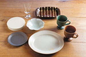 【上段左から】フランスのアンティークグラス7,700円丹窓窯角皿※在庫なし 【中央段左から】yoshidapottery/Horizonplate(リバーシブル)※取り寄せ可能美濃焼/鉢1,980円yoshidapottery/玉脚コーヒーカップ各6,050円 【下段左から】丸十窯/小皿1,320円古谷製陶所/楕円…