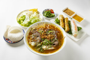 【写真のメニュー】ブンホーフエランチ935円(平日のみ) 米を主食とするベトナムは、麺や春巻などの皮も小麦ではなく、米から作るのが特徴。生春巻や揚げ春巻には、甘酸っぱいタレ(ニョクマム)やゴマダレが合い、食が進むはず。シェフのオススメは、辛い麺料理のブンボーフエで、やわらかい牛肉がのってそこからの出汁もおいしい。平日(月~金…