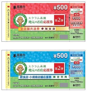 高槻市が、市内店舗で利用できるプレミアム付商品券として「スクラム高槻“地元のお店応援券”」を発行・販売する。これは消費を喚起することで、新型コロナウイルス感染症の影響により経済活動の制限を受けた飲食店等の小規模店舗の応援と、市民の家計支援を目的としたもの。2,000円で5,000円分の商品券が買えるという大変お得な券となっており、購入の際に必要となる引換券は簡易書留郵便にて市内全世帯に送付済み…