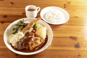 【写真のメニュー】ハンバーグ定食 900円※写真はプレーンオムレツとエビフライをトッピングver1,700円 「オーソドックスな洋食を気軽に」という想いから、25年前に茨木の住宅街で創業した「洋食屋kitchenBou」。昼も夜も食べられる定食は、ハンバーグ、エビフライ、カニクリームコロッケ、ヘレカツなど定番の洋食メ…