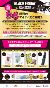 ※写真は公式サイトより ららぽーとエキスポシティで太っ腹企画が開催されますよ~!BLACKFRIDAYの目玉企画で、11/22(土)・23(日・祝)の2日間限定で詰め放題イベントが実施されます◎当日館内5,000円(税込・合算可)以上購入レシートを提示で1回チャレンジすることができます。制限時間30秒で専用の袋に好きなアイテムが詰め放題できるといもの。BLAC…