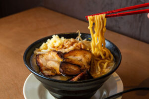 【写真のメニュー】舞台ラーメン900円 生の刻みにんにくと大きくカットした自家製チャーシュー、たっぷりのもやし、アブラ(豚の背脂)がのったボリューム満点のラーメンが看板商品で、生のにんにくならではの香りと風味がガツンと味わえる。豚骨から丁寧にとったスープにもにんにくの風味をプラスしているので奥深い味わいが楽しめる。見た目のインパクトよりは食べやすく仕上…