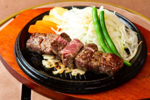 【特典】「シティライフを見た」で「手造りハムオードブル」(605円)をサービス※1グループ3名以上でご利用可 【写真のメニュー】ビフテキランチ150g1,749円※スープ、ライス、漬物付き 創業50余年の老舗焼肉店の人気ランチは約250℃に熱した鉄板の上に生のステーキ肉をのせ、客自身で好みの焼き加減になるように焼き上げるスタイル。やわらかい肉質が特徴のカイノ…
