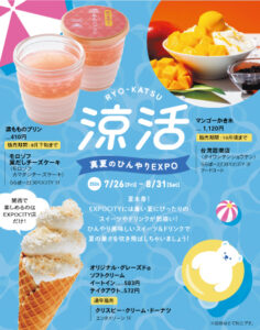 真夏のひんやりEXPOが、7/26(金)~8/31(土)開催!夏本番!EXPOCITYには暑い夏にぴったりのスイーツやドリンクが勢揃い!ひんやり美味しいスイーツ&ドリンクで夏の暑さを吹き飛ばしちゃいましょう!その他の紹介はこちらをチェック!