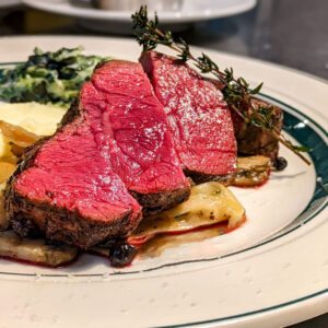 【写真のメニュー】和牛シャトーブリアン150g6,980円(2〜3人前)※写真はガルニッシュセット(680円)付き A4ランク以上の黒毛和牛の中でも最上ランクに位置される「シャトーブリアン」と「ヘレ」から選び抜いたものを使用。シャトーブリアンは箸でも切れるほどのやわらかい肉質で、甘さを感じる脂が口の中で広がる。そんなステーキと相性抜群なのが、バラエティ豊かな味わいの付け合わせ…