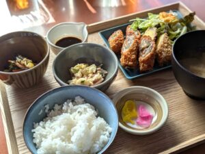 場所は、「おにクル」の近く。栄養士・調理師が作る日替わり定食のお店です。メニューはコチラ。「日替わり定食(豚しそロール照り焼き)/1500円」「日替わり魚定食(カレイの唐揚げ)/1500円」「日替わり揚げ物定食(ミックスフライ野菜の肉巻き・さつまいも)1500円」「お子さまランチ(卵・乳不使用)/800円」。定食はドリンクがセットでついてきます。豚しそロールが気になったのですが、売り切れてしま…