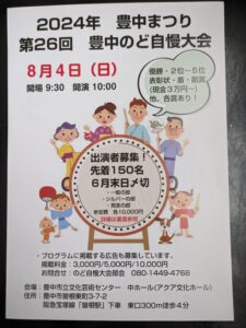 2024年「豊中まつり」に関連して開催される「第26回豊中のど自慢大会」の出場者募集が現在行われている。大会は8月4日(日)に豊中市立文化芸術センター中ホール(アクア文化ホール)で開催される。一般の部・シルバーの部・発表の部の3部構成で、参加費は各10,000円。曲目を変えれば複数参加も可能だ。応募締め切りは6月30日。応募方法など詳しくは市のホームページを。 &nb…