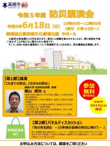 高槻市は、市民が改めて防災の重要性を認識する機会を作るため、防災講演会を開催する。関西大学社会安全学部越山教授の基調講演と、「先の先を読む10年後の高槻の防災に向けて」をテーマに中学生が「将来起こり得る災害に対して不安に感じること」を絵で表現。描いた絵を題材に被害を軽減するための防災対策を話し合うパネルディスカッションを通じて参加者全員が防災について考える機会を提供する。 【日時】…