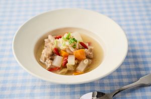 かぶや大根、ごぼうといった冬の根菜をたっぷりと使ったスープ。さらに雑穀も加える…