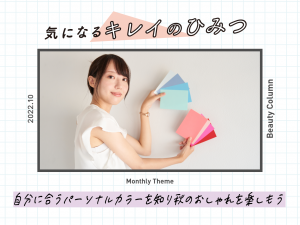 最近よく聞く「パーソナルカラー」という言葉。肌・髪・瞳の色など、自分が生まれ持った色素をもとにして、その色素と調和のとれる色のこと。「コスメやファッションなどに、パーソナルカラーを取り入れることで、肌や顔色を美しく見えたり、スタイルが良く見えたり、その人のもつ個性を引き出してくれます」。一方で、合わない色を取り入れてしまうと、シミやくすみが目立ったり、疲れた表情にみえたりとマイナスの…