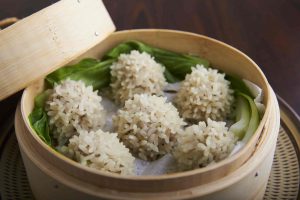 シュウマイと言えば、小麦粉で作った皮で包んで作りますが、今回はもち米を使用。丸めた肉ダネにもち米をつける簡単な作業なので、お子様と一緒に作るのも楽しいかも。「モチモチとしたもち米とジューシーな肉ダネのバランスが絶妙で、見た目よりもボリュームがあります。シュウマイと一緒に白菜やチンゲン菜を蒸し器で蒸すと、彩りも鮮やかに仕上がります」。そのまま食べても十分美味しいが、お好みで醤油や酢、辛子を添えても…