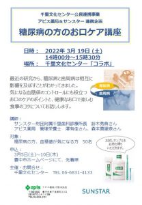豊中市は3月19日にコラボで「糖尿病の方のお口ケア講座」を開催する。サンスター財団の協力のもと、口腔ケアのポイントなどのレクチャーが受けられるアピス薬局千里中央店と千里文化センターコラボとの公民連携事業だ。サンスター財団付属千里歯科診療所長の鈴木秀典氏と、アピス薬局管理栄養士の澤有佳氏・森本真里奈氏を講師に迎え、血糖値のコントロールにも役立つ口腔ケアのポイントや食事のコツなどの話がある…