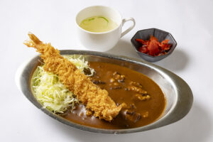【写真のメニュー】大エビフライカレー990円(スープ付き) 石川県のご当地カレー「金沢カレー」が食べられる店。低温で長時間焙煎したルーに牛肉、野菜、秘伝の調味料を加え加熱したカレーは、ドロッと濃厚。独特のスパイシーさと香ばしさ、深いコクを感じさせる。ステンレスの皿にのせた白米をカレーで完全に覆い尽くし、千切りキャベツをのせるの…