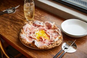 【写真のメニュー】ビスマルク2,650円数々の世界大会で賞を獲得したピッツァ職人が腕をふるう人気店。大きなサイズながら、軽くペロリと食べられるような生地作りを目指しているそう。「ビスマルク」は、スライスしたマッシュルームと旨みの強いイベリコ豚のハム、卵の組み合わせが絶妙な一枚。生ハムとは違い加熱したハムを使うことで、深い旨みを感じることができる。
