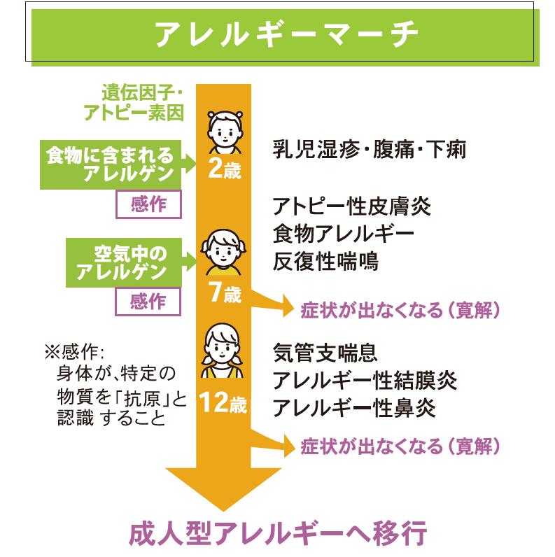 アレルギーは身近な病気ですが、時にその深刻さが軽視されがちな側面もあります。乳幼児期の湿疹から始まり、食物アレルギー、喘息、花粉症へと年齢とともに次々と発症していく一連の流れがあり、この現象は「アレルギーマーチ」と呼ばれ、早期からの対策が重要視されています。特に、乳児期の湿疹は、全てのアレルギーの最初に出やすい症状であり、アレルギーの入り口とも言えます。お子さんの肌はデリケートで、特に生後間もない時期から顔や首筋に湿疹が出やすいものです。この肌のバリア機能が低下した状態を放置してしまうと、そこからダニやハウスダスト、食物などのアレルゲンが侵入しやすくなり、食物アレルギーや喘息といった次の段階のアレルギーへと移行するリスクが高まってしまうのです。重度な皮膚炎は、お子さんの成長障害や、かゆみで眠れないなど生活の質(QOL)の低下にもつながる可能性があります。だからこそ、「そのうち治るだろう」と安易に考えず、最初の一歩である肌の問題から、専門家に相談して適切に対応することがとても大切です。
