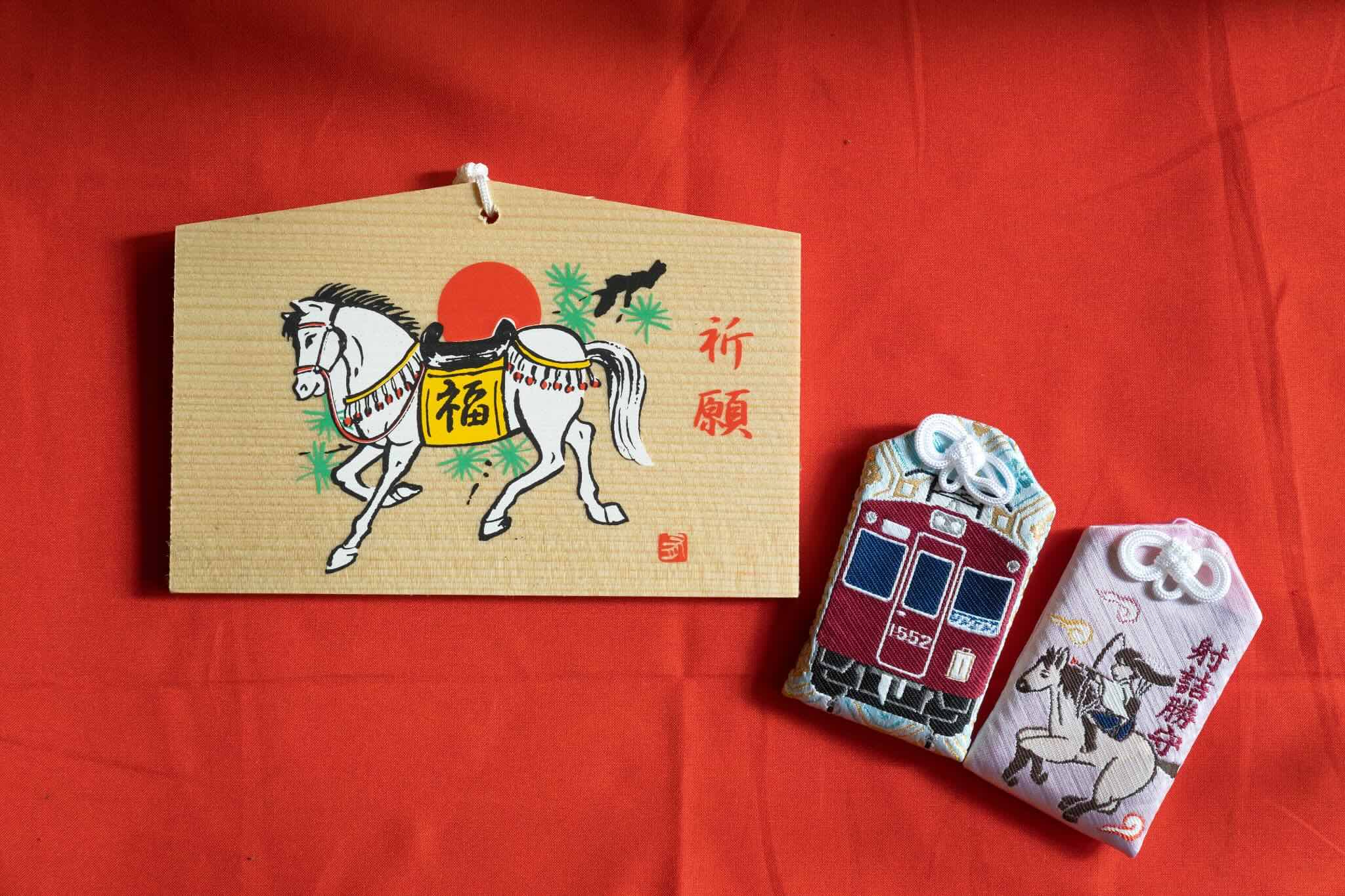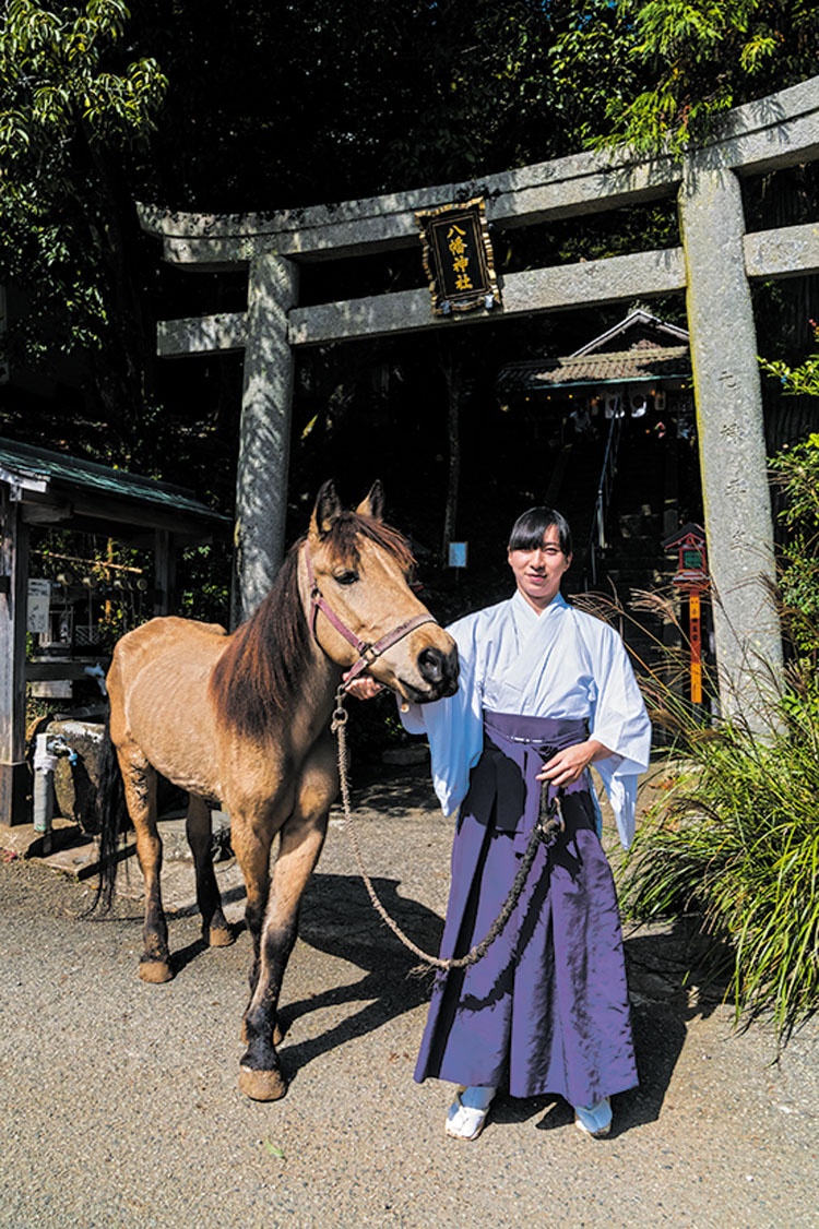 平安時代に源頼仲が創建したとされる神社。大阪府最北端の八幡宮として、南に位置する難波宮の都を守護してきたそう。午(うま)の方角である南を向いていることから、「馬の神社」としても親しまれている。全国には御神馬のいる神社は15社あるそうで、大阪で御神馬に出会えるのはここだけ。御神馬「いづめ」は、日本在来種で天然記念物にも指定されている木曽馬の8歳のオス。毛並みが金色の“金馬(きんめ)”として特に縁起がいいとされている。境内には引退した能勢電鉄の車両の前面も保存されており、多くのファンが訪れるスポットとなっている。