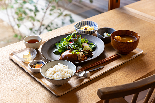 10月にJR山崎駅前へ移転オープンした「Relish食堂&Grocery Store」。オーナーは長年大山崎町で料理教室を主宰し、レシピ本も多数手掛ける料理家・森かおるさん。中庭を眺める趣ある古民家で、無添加調味料と有機野菜を使ったランチやスイーツが楽しめる。「レシピはご自宅でも再現できるよう心掛けてます。お気軽にスタッフまで」と、森さん。上の写真は、旬の食材を使った「季節のおひるごはん」1,980円。月替わりでメニューが新しくなるので、いつ行っても楽しめる。