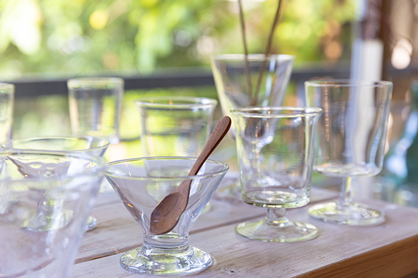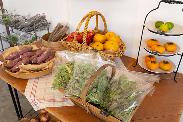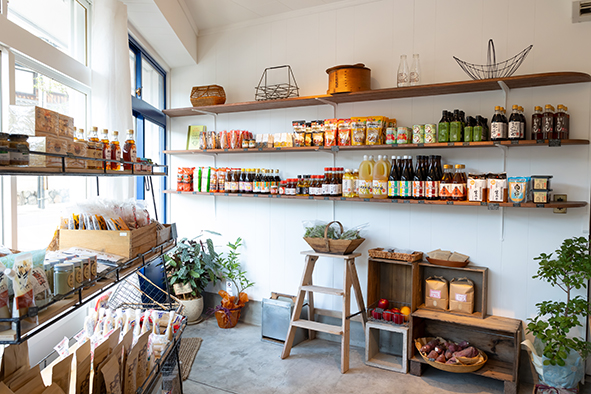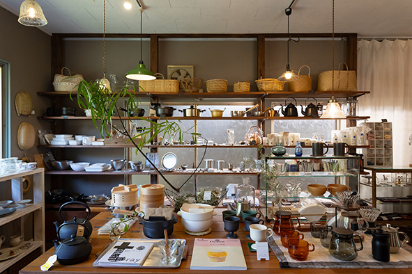 食堂の近くには、料理教室で使われている調理道具や作家の器、生活雑貨が集められた雑貨店兼ギャラリーも。毎週土曜朝9時~11時は、庭で有機野菜や調味料、パンなど身体にやさしい食材が並ぶ朝市「山崎ビオマルシェ」を開催している。