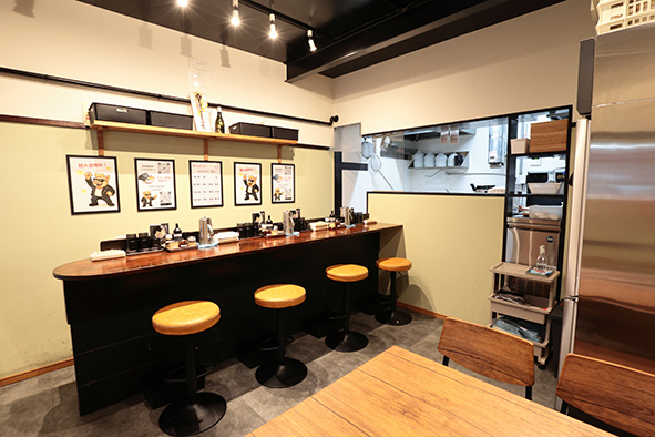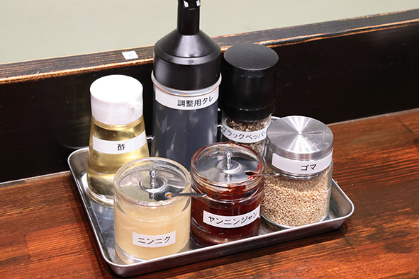 麺は博多で一般的な細麺ではなく、京都の老舗製麺所「麺屋 棣鄂(ていがく)」と共同開発した特注の平打ちちぢれ太麺でもちもちとした食感と濃厚なスープをしっかりと絡め取る。