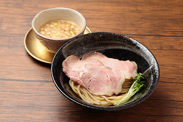 あっさり派の方におすすめなのが「鶏つけめん」。こちらは年配の方や女性に特に人気が高く、豚骨も使用しつつ鶏ガラをメインにしたにした深いコクも感じられる。出汁の抽出はじっくりと低温で行い、雑味や臭みが出ないよう繊細に仕上げ、さらに3~4種類の魚介出汁をブレンドし、鶏専用の返し(タレ)と合わせている。
