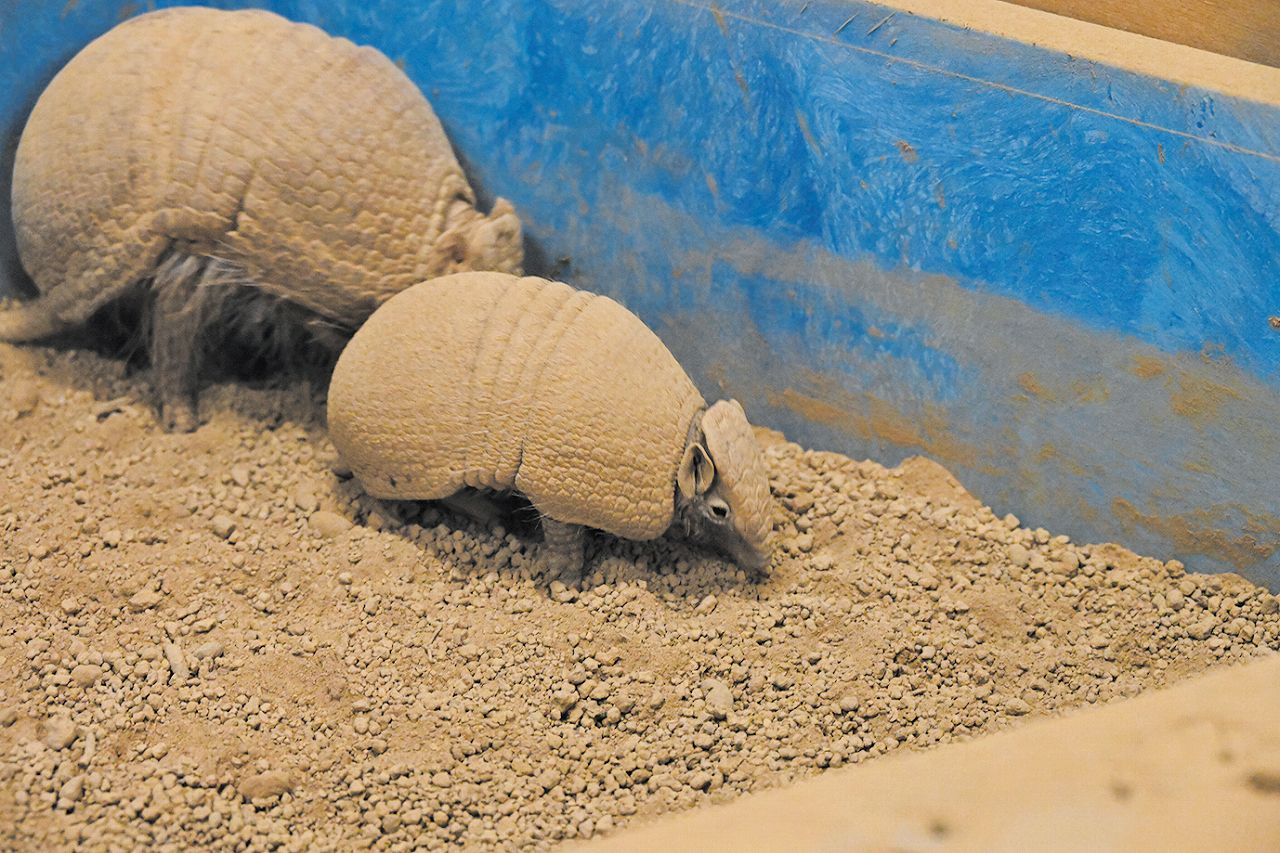 マタコミツオビアルマジロのこどもがデビュー 「うごきにふれる」では、10月1日生まれのマタコミツオビアルマジロのこどもが元気に成長中です。活発になる夕方からは、タイミング次第で動く姿を見られるかも!