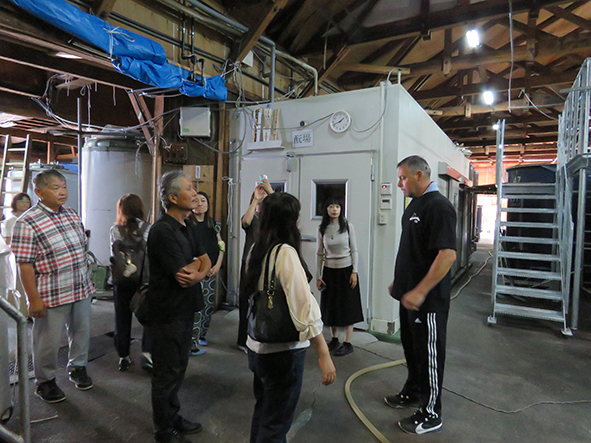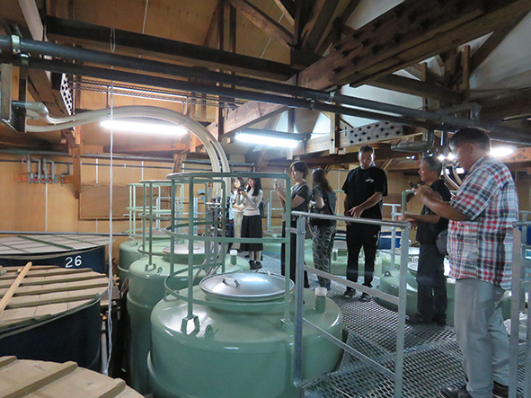 日本酒づくりの現場を実際に見学。階段を登ってタンクを上から眺める光景は圧巻でした。壽酒造で醸造されている清酒「國乃長」やクラフトビール、焼酎などは、ただ美味いというだけではなく、料理を引き立たせ、華を添える「食中酒」をめざしているそう。