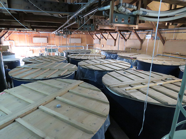 「cafe sud」から壽酒造までは徒歩3分。さっそく酒造責任者のオザンさんが案内してくれました。まずは井戸を見学。現在も壽酒造では阿武山山系の石灰層を通って湧き出る地下水を使用しており、この水と良質な原料米に恵まれたことで、500年以上前から酒造りが行われてきました。