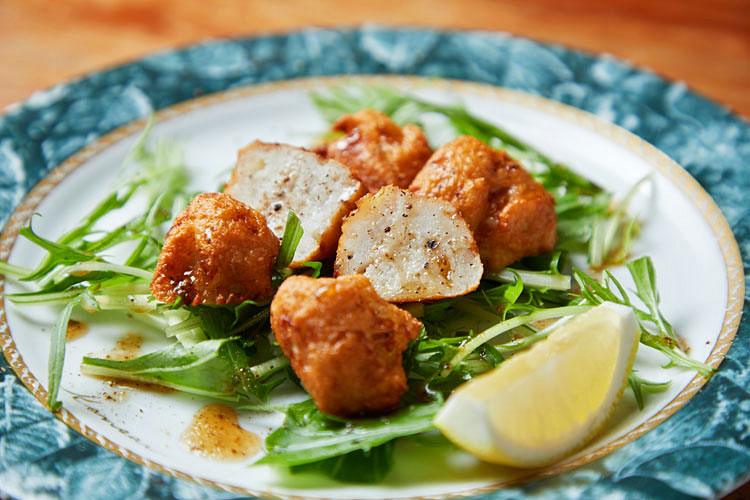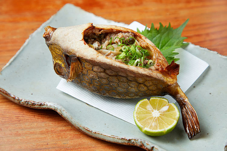 長崎県・五島列島出身の店主が故郷の食材で作る郷土料理が評判。「はこふぐの味噌焼き」は、くり抜いた腹に麦味噌とカワハギの肝などを詰めて焼き上げた一品で、濃厚な旨味が魅力。ご飯のおともにも、酒のアテにもぴったりだ。「とびうおのすり身のばらもん揚げ」は、いわゆる五島名物の揚げ蒲鉾で、魚の旨味とプリッとした食感が楽しめる。北摂では珍しい離島グルメを味わってみよう。