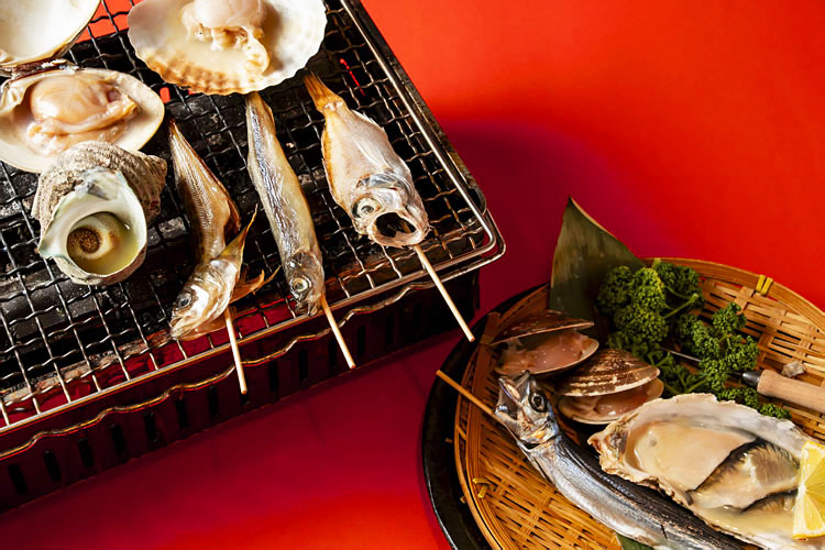 各席に備え付けられた網焼き器で、その日入荷した魚介類などを客自身が焼いて楽しむスタイル。目の前で焼くことで、味だけでなく香りや音までも楽しめるのが嬉しい。テーブルには美味しく焼くコツをまとめた案内が置かれており、初心者でも安心して焼くことができる。炉端焼きだけでなく、だし巻きやから揚げといった定番の居酒屋メニューも豊富にラインナップ。