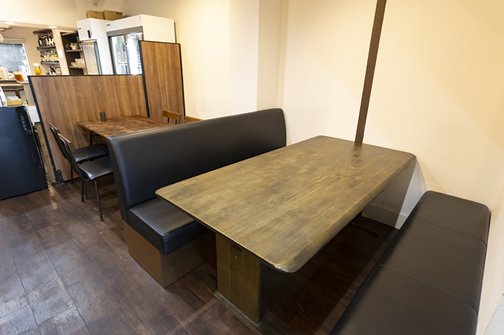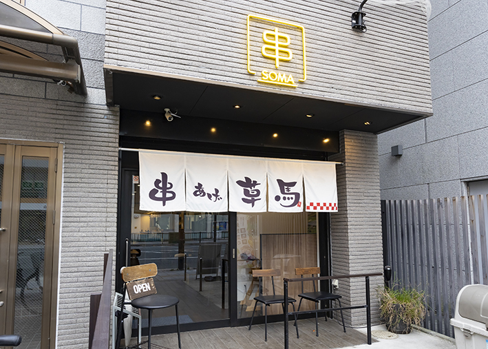 和食を中心に修業を積んだ店主の「創作串揚げ」が楽しめる草馬。お昼には、高槻樫田の無農薬栽培のヒノヒカリと特製出汁で鯛を丸ごと炊いた「鯛めし」が食べ放題に。一番人気の「鯛のごま刺し」は、出汁にすりごま、醤油、白味噌を加えたコクのある味わい。鯛めしはとろろをかけたり、出汁をかけて「お茶漬け」として味わおう。夜は串揚げ(12本2,380円~)や一品メニューを種類豊富なお酒と味わえる。