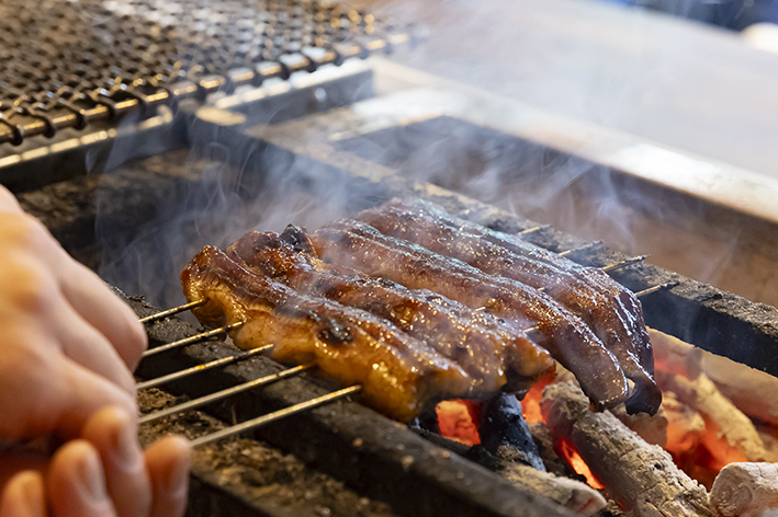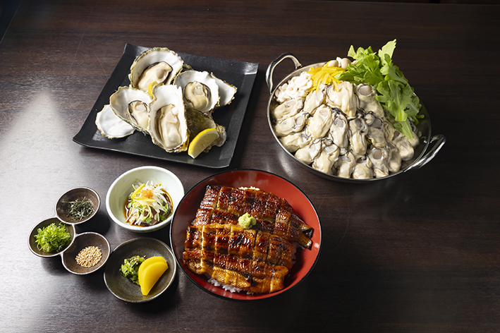 愛知県産の鰻を、備長炭で白焼きにしたのち、蒸してからふっくらと焼き上げたひつまぶしは、鰻のおいしさを最大限に引き出した逸品。そのままいただくもよし、出汁茶漬けで味わうのもおすすめ。また広島直送の自慢の牡蠣は「焼き牡蠣」や「牡蠣鍋」で楽しむことができ、煮込んでも小さくなりにくい牡蠣を使用しているため、最後までプリプリの食感と旨みが楽しめる。