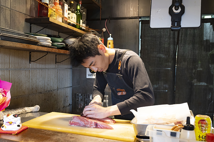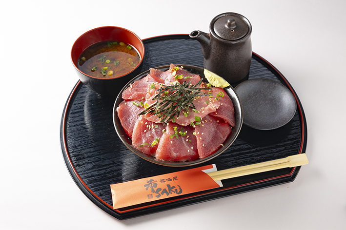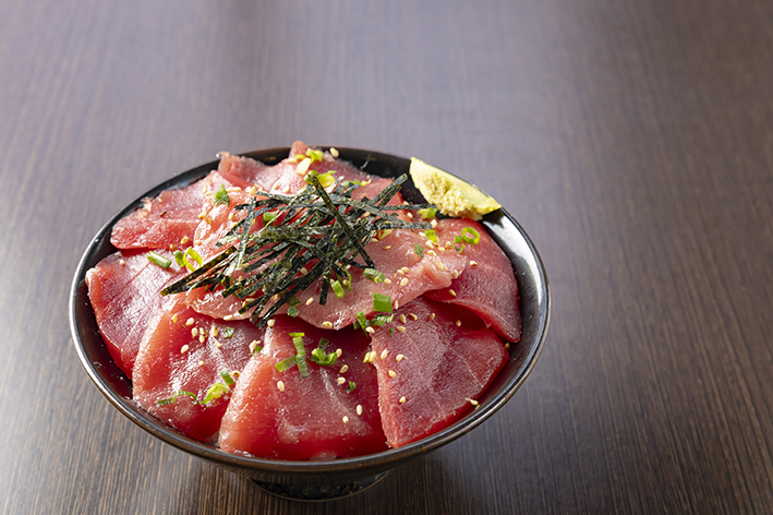 市場から直送される生本マグロや生サーモンを全10種の海鮮丼で楽しめる。注目すべきは、鮮度への徹底したこだわり。冷凍保存されたものは一切使わず、提供する日の朝に捌き、切りたての鮮度で届けられる。赤身に加え、中トロも盛り込まれているのでマグロの旨みを堪能できると好評だ。お米は滋賀県の農家から仕入れ、刻んだ大葉と胡麻が混ぜられるなどひと工夫がうれしい。