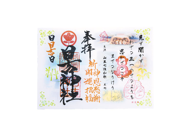 創建は1573年。武将の荒木村重が、織田信長に功績を認められ、滋賀県の日吉大社から分社したのが始まり。本殿には象徴である神猿(まさる)が祀られており、「魔が去る」「何事にも勝る」など、縁起を担ぐ神社として親しまれている。御朱印にも、「見ざる・言わざる・聞かざる」の三猿の意匠と、メッセージが添えられている。