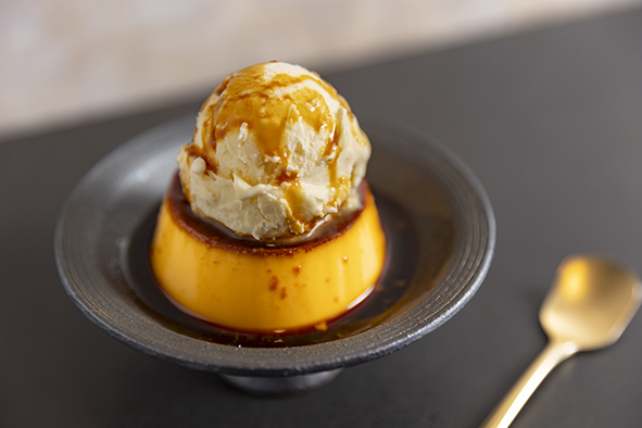 創業40年の喫茶店が3年前にリニューアル。モーニングは4種、ランチも3種が揃い、お昼どきは賑わいを見せるので、プリン目当てなら14時以降の来店がおすすめ。食べた瞬間に思わず「懐かしい」と感じる、かためのプリンは甘さは控えめながら、焦がし気味のカラメルとのバランスが絶妙。濃厚なバニラアイスのせでいただきたい。モーニングはお好きなドリンクに+200円でトーストとサラダ、+250円でトーストとサラダ、ゆで卵、+300円でトーストとサラダ、目玉焼きorスクランブルエッグ、ウィンナー付きが選べる。ランチは日によってメニューが変わる気まぐれランチ1,250円のほか、定番のハンバーグランチ1,300円(デミグラスソースor和風きのこあんかけ)やとんかつランチ1,350円が揃う。プリンはそれぞれミニサイズもあるため、ランチの後に注文する人も多い。またランチメニューは+250円でドリンクを付けることができ、コーヒーはサイフォンで淹れているのでゆったりと食後のひとときを楽しもう。