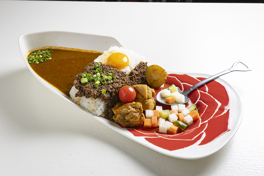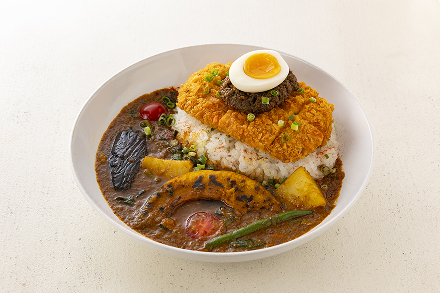 茨木のスパイスカレー店として人気を誇る同店。メニューの基本は14種類のスパイスづかいが光るプレーンカレーとキーマカレーの2種類があり、その両方を味わえるのがこのプレミアムシリーズだ。6種類の野菜は茹でる、蒸し煮、揚げ焼きなどそれぞれに調理法を変えておいしさを引き出している。トッピングをいちばん人気のカツタシにすれば、すべてカツカレーにできる。