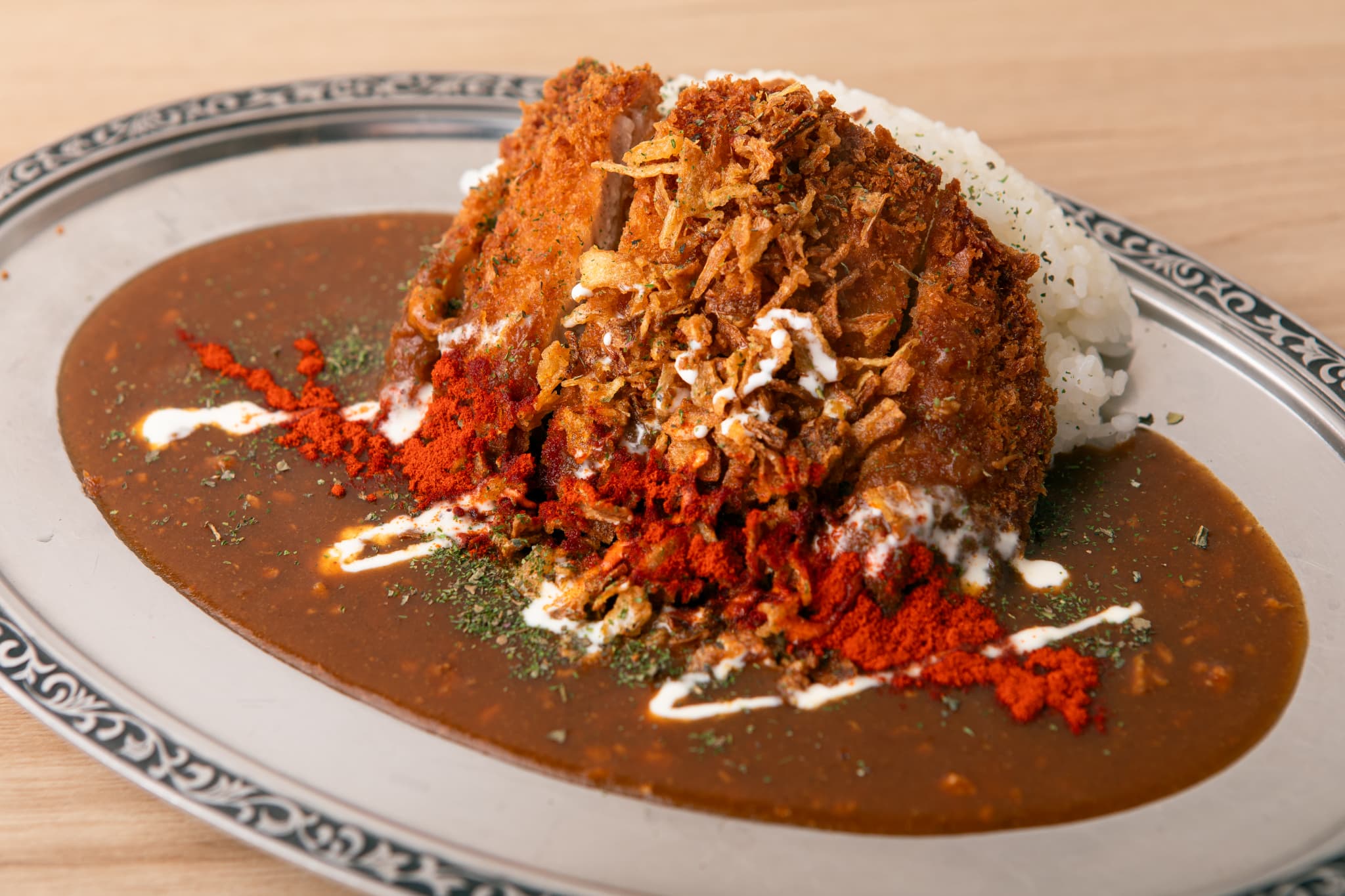 2025年1月オープンのキーマカレー専門店。国産の挽き肉を使ってじっくりと煮込んだカレーは、一口食べるとフルーティな甘さを感じる。さらに食べ進めるとスパイシーさと適度な辛さを感じられ、そのバランスが秀逸。あくまでも主役はカレーということで、トンカツは薄めに仕上げている。トッピングのフライドオニオンの食感が心地よく、パプリカパウダーとパセリ&バジルの香りが爽やかさをプラスしているので、最後まで飽きることなく味わうことができる。こじんまりとした店内にはテーブル席が2つあるが、店舗前にもテーブル席が設置されているので、これからの季節には屋外でカレーを味わうのもいい。