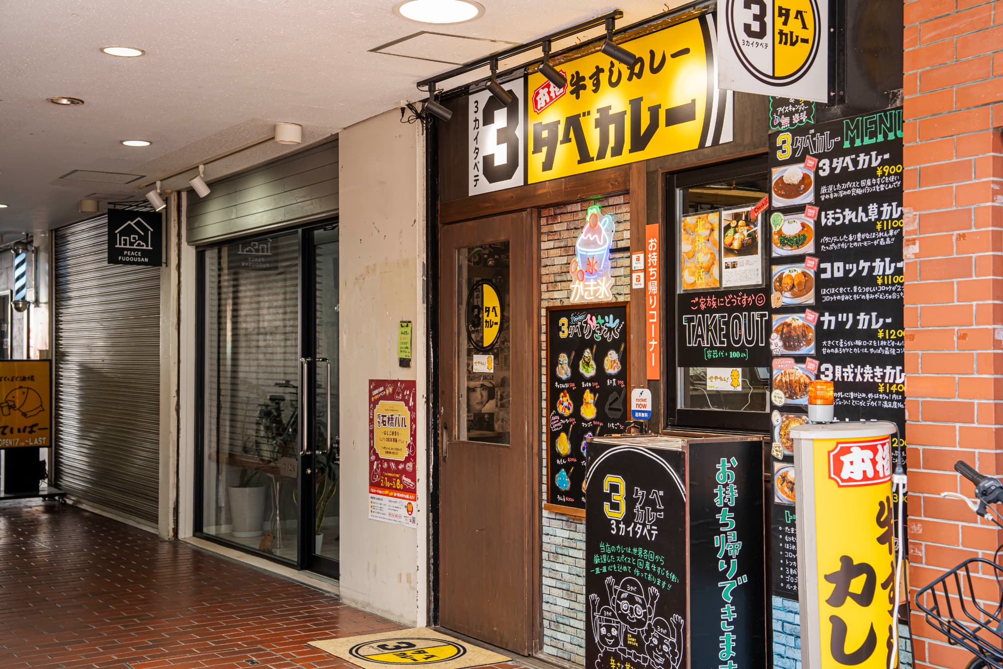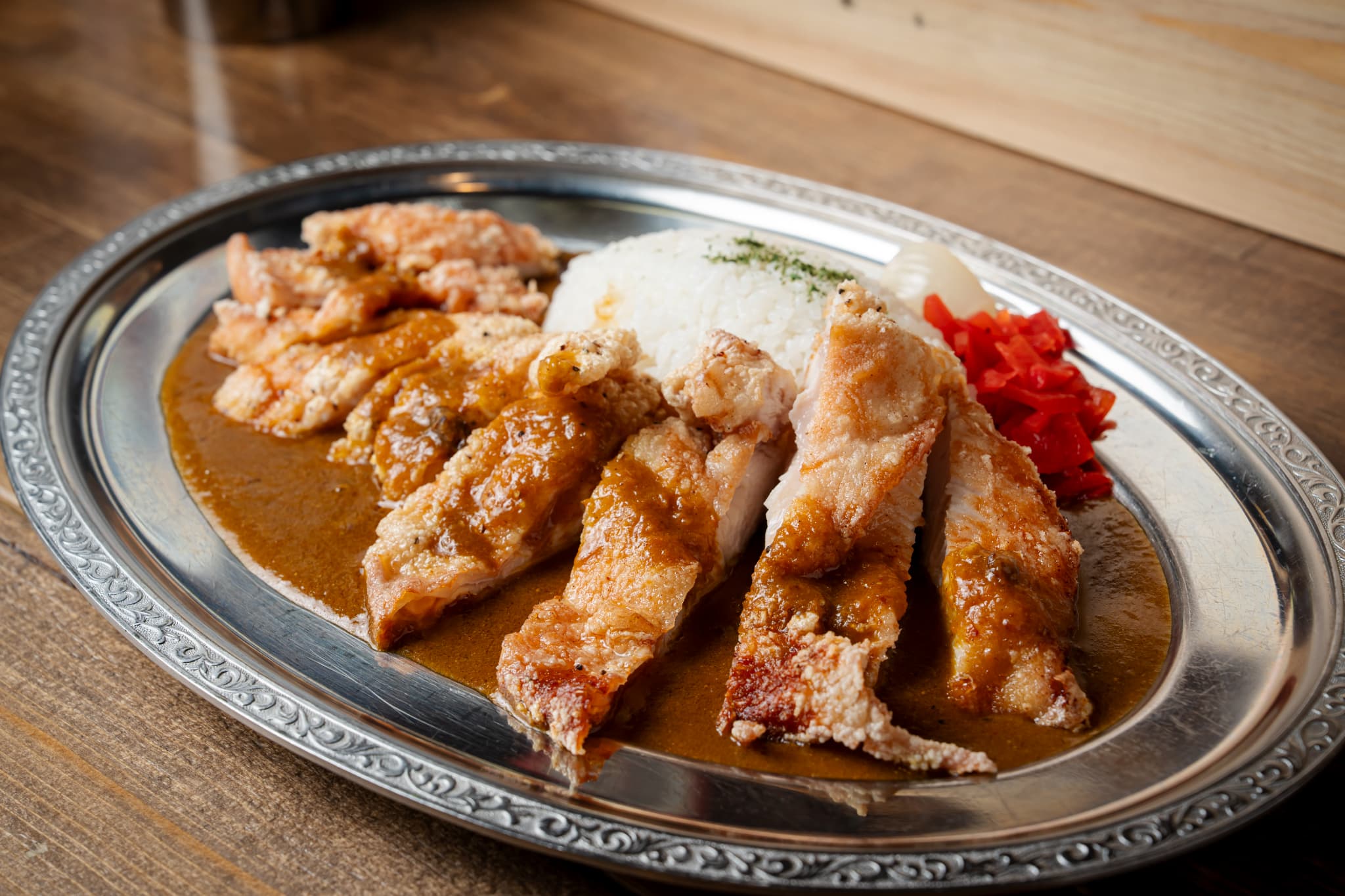 九州産のA5ランクの黒毛和牛の牛すじと桃やりんごなどのフルーツ、十数種類のスパイスを調合した自慢のカレーは、牛すじの濃厚な旨みとフルーティさが溶け合ったまろやかながらもスパイシーな味わいだ。「3賊焼きカレー」は、長野県の郷土料理である「山賊焼き」をアレンジした大きな鶏胸肉のから揚げが鎮座する。東北のブランド鶏の胸肉を2日かけて仕込んだ自慢のから揚げはやわらかくてとてもジューシー。そのボリュームに驚くが、意外とペロリと食べられるからさらに驚く。ご飯とカレーを混ぜ合わせ、チーズとパン粉をのせて焼いた「焼きカレー」(1,200円)や、A5ランクの牛肉がたっぷり入った「ゴロゴロ牛カレー」(1,300円)なども人気。