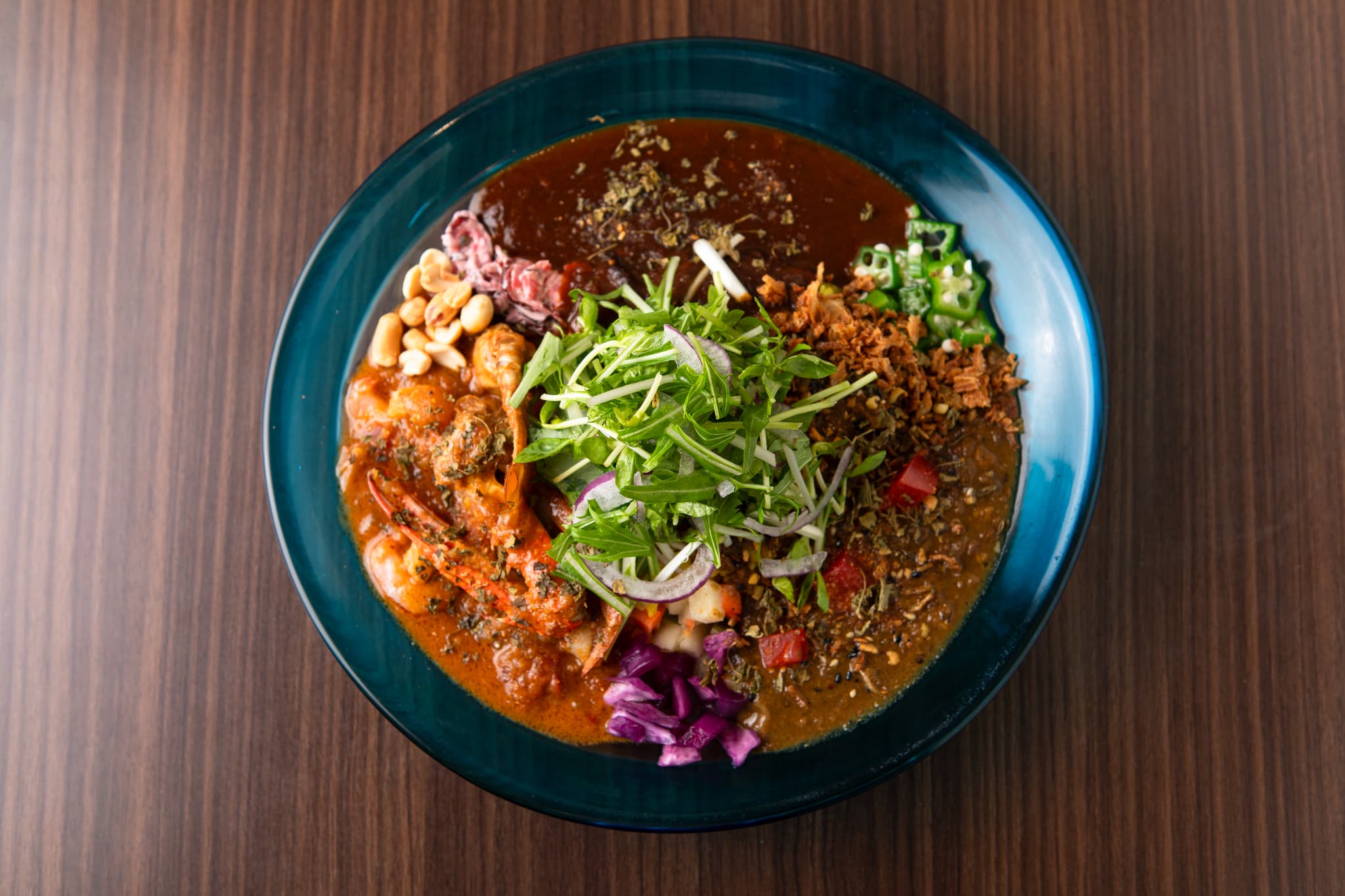 イタリアンやフレンチのシェフとして長年活躍していた店主が辿り着いたのが、バランスのとれた繊細な味わいのスパイスカレー。1番人気は「オリジナルスパイスキーマカレー」で、20種類以上のスパイスを使い、合い挽き肉の旨みを引き立たせる。中にはあえて大きめにカットしたスパイスも入っているのでザクザクとした食感も楽しい。「渡り蟹出汁!!海老のスパイスカレー」はフレンチの技法を取り入れ、ビスクのような香り豊かなカレーになっている。「和牛ビーフカレー」は食べやすさをとことん追求したカレーで、幅広い世代に人気なのだとか。個性豊かなカレーが15種類以上あるので、じっくりと好みのカレーを選ぶことができるのも嬉しい。