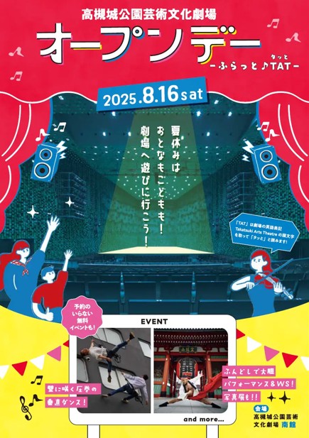 8 月 16 日(土)に高槻城公園芸術文化劇場で、北摂最大級の 1500席を備えるトリシマホールの自由見学会、東映京都撮影所による迫力満点の侍ショー、無料コンサートなど子どもから大人まで楽しめる内容盛りだくさんのイベント「オープンデー ふらっと TAT」が開催される。