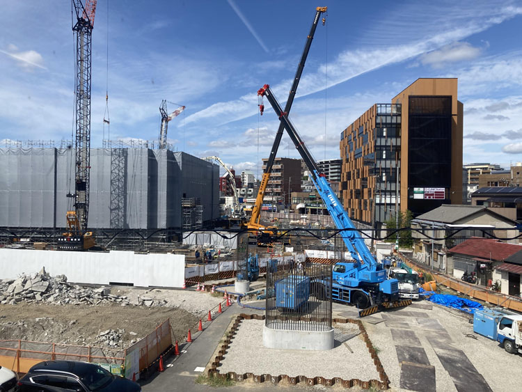 JR千里丘駅(2F)から現地をのぞむと、仮店舗で営業をしていた関西みらい銀行のプレハブも撤去され、令和7年3月からは1街区施設建築物の基礎工事が始まり、7月には自由通路(橋脚基礎の配筋)の工事も行われている。事業完了は令和9年春の予定で、完成後は駅前が大きく生まれ変わることになる