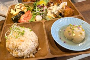 今回は、「プレートランチ」を注文しました。スープバー(御替り自由)、塩こうじ唐揚げなど温菜3種、塩こうじポテトサラダなど冷菜3種、サラダ、土鍋で炊いたご飯が付いてます。
