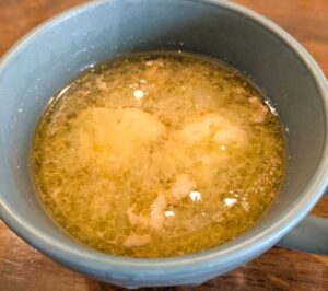お味噌汁と水はセルフになっていて、この日は「豚汁」でしたがブロッコリーやカリフラワーも入っていて驚きました。以外に合う!(^^)!