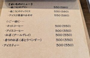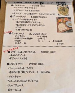 メニューはこちら。ランチは「パスタランチ/1500円」「プレートランチ/1500円」「ランチコース/3000円」。「デザートドリンクセット/500円」「ドリンクセット/200円」。