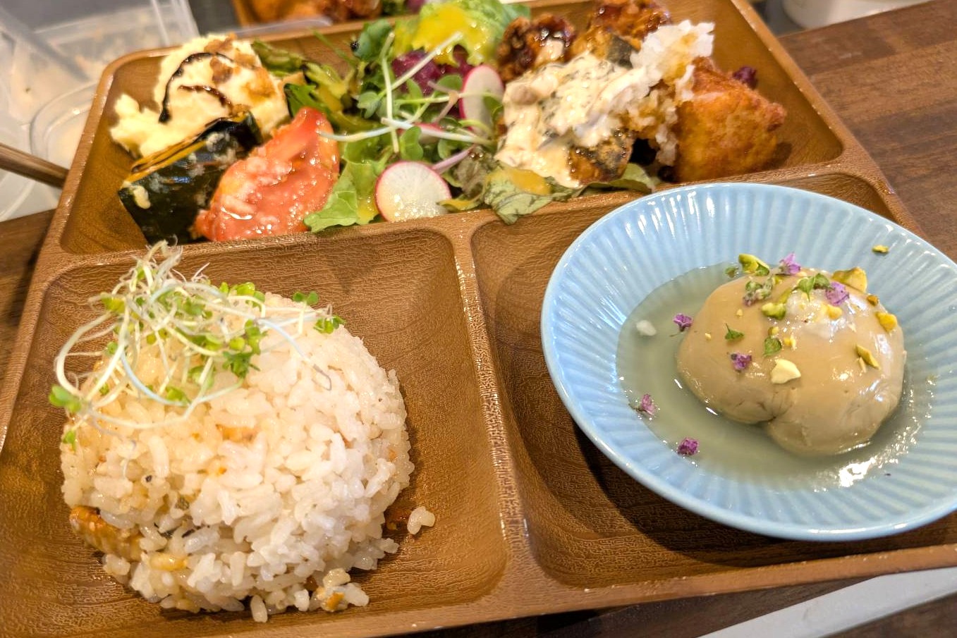 今回は、「プレートランチ」を注文しました。スープバー(御替り自由)、塩こうじ唐揚げなど温菜3種、塩こうじポテトサラダなど冷菜3種、サラダ、土鍋で炊いたご飯が付いてます。