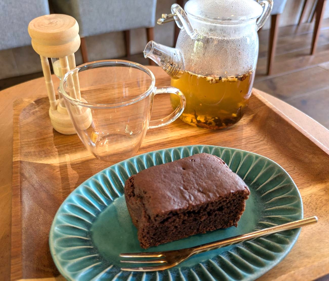 紅茶の蒸らし時間を砂時計でするなんて、なんてオシャレ♪砂が落ちるまでのゆっくりじっと待つ時間が贅沢に感じました。色んな茶葉をブレンドされてるそうで、飲み始めると体がポカポカしてきて、シナモンが入ってるのだけ分かりました(^^♪ガトーショコラもしっとりで美味◎この日はまだ暑かったので店内で頂きましたが、もう少し涼しくなったら、ガーデンで頂きたいと思います☆