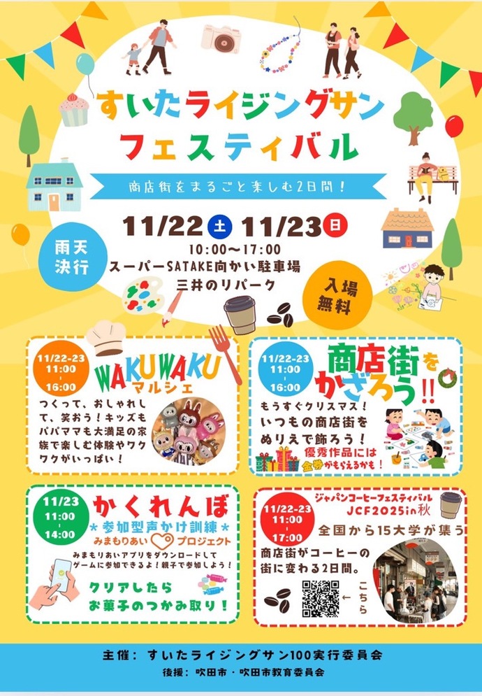 ■内容:JR吹田駅周辺商店街において、吹田市に位置する大学生を中心としたコーヒーサークルによるコーヒーフェスティバルや、WAKUWAKUマルシェ、親子で楽しめるワークショップ、かくれんぼやトークショーなど老若男女が楽しめるイベントを開催。