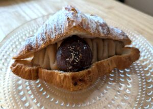 「クロワッサンモンブラン」はたっぷりのホイップクリームとモンブランクリームが大きめの外サクサク中しっとりのクロワッサンとマッチ☆渋皮栗の甘さも丁度良く、タルト生地より好きです(^^♪