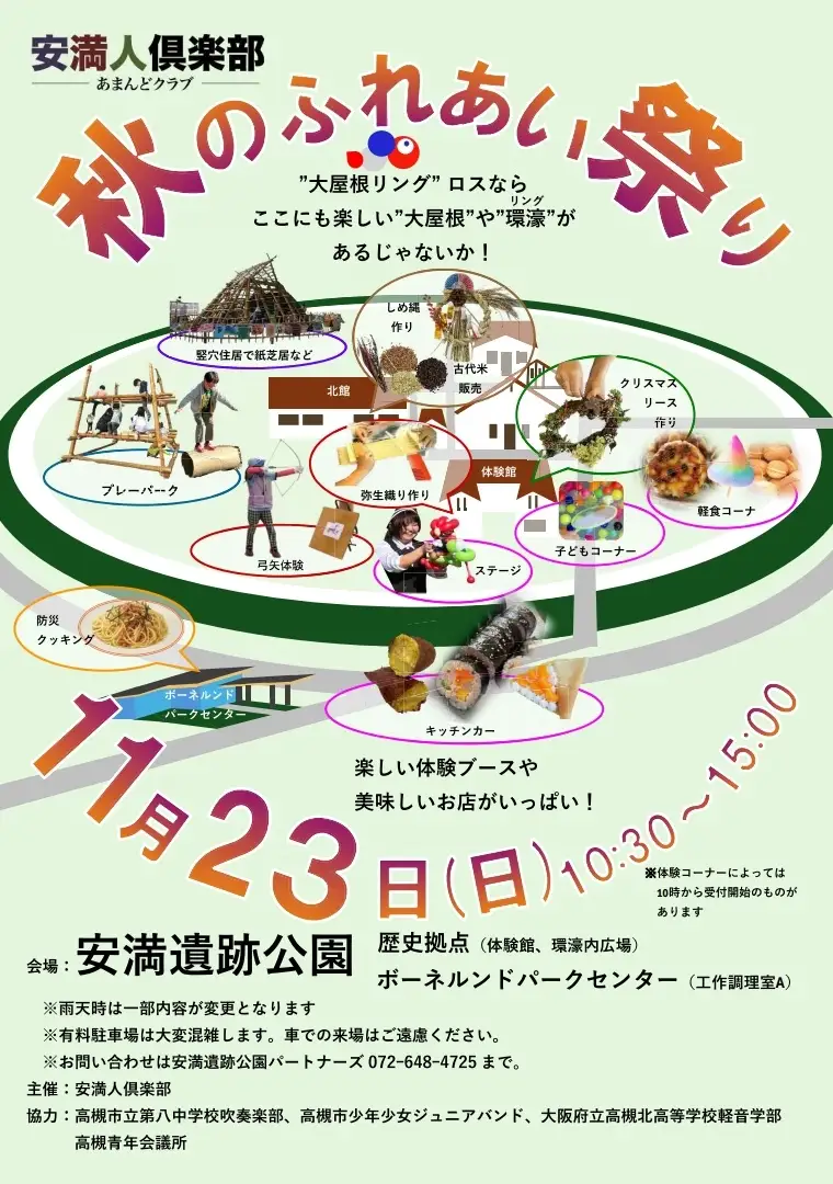 11月23日(日祝)に高槻市の安満遺跡公園で「秋のふれあい祭り」が開催される。公園内に復元された竪穴住居の中でのお話し会や紙芝居、古代米のわらを使った縄飾り作りなどが予定されている。