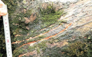 大阪府作成クマ注意喚起チラシより 木の皮を剥いだ跡。 山中で見かけた場合は、周囲に気をつけるとともに、市町村に報告を。