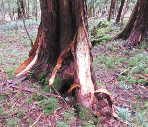 大阪府作成クマ注意喚起チラシより 木の皮を剥いだ跡。 山中で見かけた場合は、周囲に気をつけるとともに、市町村に報告を。